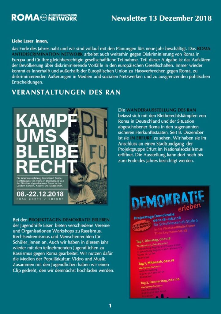das Ende des Jahres naht und wir sind vollauf mit den Planungen fürs neue Jahr beschäftigt. Das ROMA ANTIDISCRIMINATION NETWORK arbeitet auch weiterhin gegen Diskriminierung von Roma in Europa und für ihre gleichberechtigte gesellschaftliche Teilnahme. Teil dieser Aufgabe ist das Aufklären der Bevölkerung über diskriminierende Vorfälle in den europäischen Gesellschaften. Immer wieder kommt es innerhalb und außerhalb der Europäischen Union zu Hassverbrechen gegen Roma, zu diskriminierenden Äußerungen in Medien und sozialen Netzwerken und zu ausgrenzenden politischen Entscheidungen.