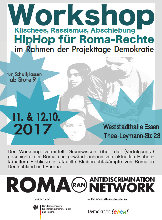 Der Workshop vermittelt Grundwissen ober die (Verfolgungs-) Geschichte der Roma und gewährt anhand von aktuellem Hiphop Künstlern Einblicke in aktuelle Bleiberechtskampf von Roma in Deutschland und Europa