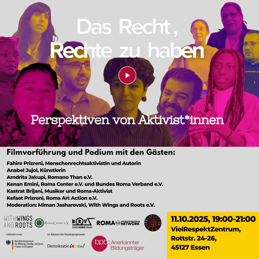Eine gemeinsame Veranstaltung von Roma Center, Bundes Roma Verband, Roma Art Action und With Wings and Roots. Ein Film von RomaniPhen e.V. und With Wings and Roots e.V., entstanden im Bündnis Pass(t) uns allen.