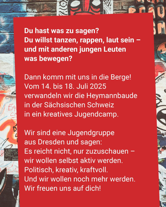 Du hast was zu sagen? Du willst tanzen, rappen, laut sein – und mit anderen jungen Leuten was bewegen? Dann komm mit uns in die Berge!