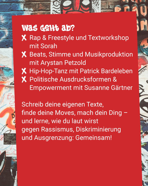 Schreib deine eigenen Texte, finde deine Moves, mach dein Ding – und lerne, wie du laut wirst gegen Rassismus, Diskriminierung und Ausgrenzung: Gemeinsam!