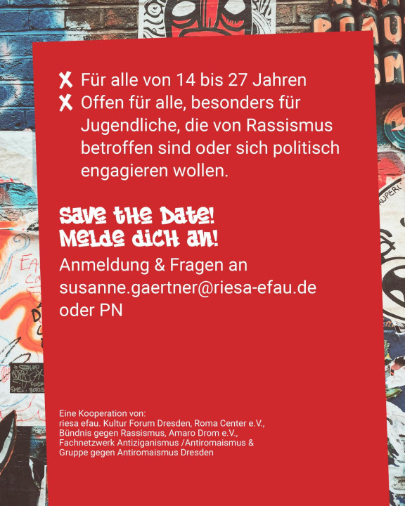 Eine Kooperation von: riesa efau. Kultur Forum Dresden, Roma Center e.V., Bündnis gegen Rassismus, Amaro Drom e.V., Fachnetzwerk Antiziganismus / Antiromaismus & Gruppe gegen Antiromaismus Dresden